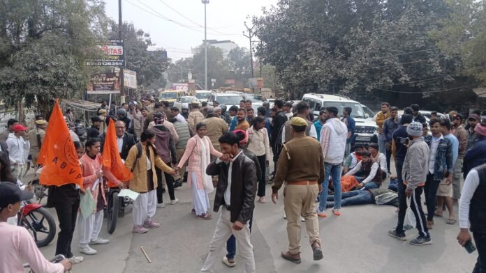 मिर्जापुर विश्वविद्यालय के परीक्षा परिणामों में गड़बड़ी का आरोप, एबीवीपी छात्रों ने बिंन्नानी कॉलेज के सामने किया मार्ग जाम