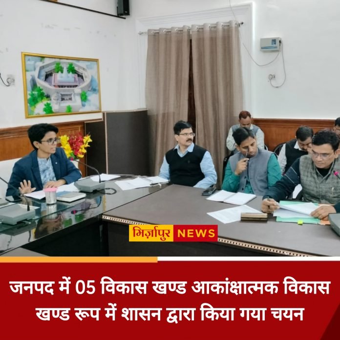 शासन द्वारा प्रदेश के 34 जनपदो में कुल 100 विकास खण्डो को उनके पिछड़ेपन के आधार पर आकांक्षात्मक विकास खण्ड के रूप में चयन किया गया। जिसमें जनपद मीरजापुर के 05 विकास खण्ड यथा-हलिया, मड़िहान (पटेहरा कला), सिटी, पहाड़ी, राजगढ़ को आकांक्षात्मक विकास खण्ड के रूप में चयन किया गया हैं।