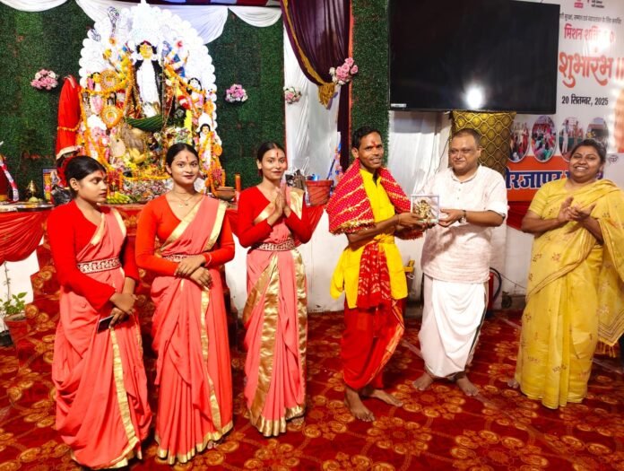 दिनांकः01.10.2025 को ‘शारदीय नवरात्रि’ की महानवमी के पावन अवसर को पुलिस लाइन मीरजापुर में प्रथम बार स्थापित माँ दुर्गा जी की प्रतिमा का विधि विधान से आरती व पूजन किया गया । सर्वप्रथम *“सोमेन बर्मा” वरिष्ठ पुलिस अधीक्षक मीरजापुर* द्वारा *मण्डल आयुक्त विन्ध्याचल मण्डल “बालकृष्ण त्रिपाठी”*, *जनपद न्यायधीश मीरजापुर “अरविन्द कुमार मिश्रा”*, *”पवन कुमार गंगवार” जिलाधिकारी जनपद मीरजापुर* सहित परिवार के आगमन पर पुष्पगुच्छ प्रदान कर स्वागत किया गया । तत्पश्चात मुख्य अतिथिगण की उपस्थिति में पश्चिम बंगाल से आये कलाकारों द्वारा माँ दुर्गा जी की प्रतिमा का विधि विधान से आरती व
