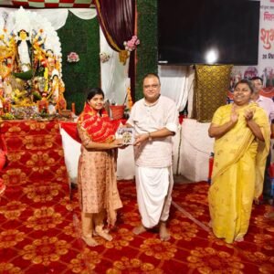 द्वारा माँ दुर्गा जी की स्मृति चिह्न प्रदान कर सम्मानित किया गया तथा साथ ही वरिष्ठ पुलिस अधीक्षक मीरजापुर व उनकी पत्नी द्वारा अपराजिता डायरेक्टर डेफोडील्ह स्कूल व प्र0नि0 को0शहर नीरज पाठक को अंग वस्त्र तथा मां दुर्गा जी की स्मृति चिह्न प्रदान किया गया । इसी क्रम में क्षेत्राधिकी लाइन- शिखा भारती (मुख्य आयोजक) तथा माँ दुर्गा जी की आरती पूजन करने आये पश्चिम बंगाल के कलाकारों को अंग वस्त्र व माँ