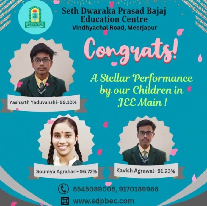 सेठ द्वारका प्रसाद बजाज एजुकेशन सेंटर के 12वीं उत्तीर्ण विद्यार्थियों ने JEE Mains 2026 में उत्कृष्ट प्रदर्शन कर विद्यालय और जिले का नाम रोशन किया है। परीक्षा परिणामों में छात्रों ने शानदार प्रतिशत अंक अर्जित कर अपनी प्रतिभा का परिचय दिया।